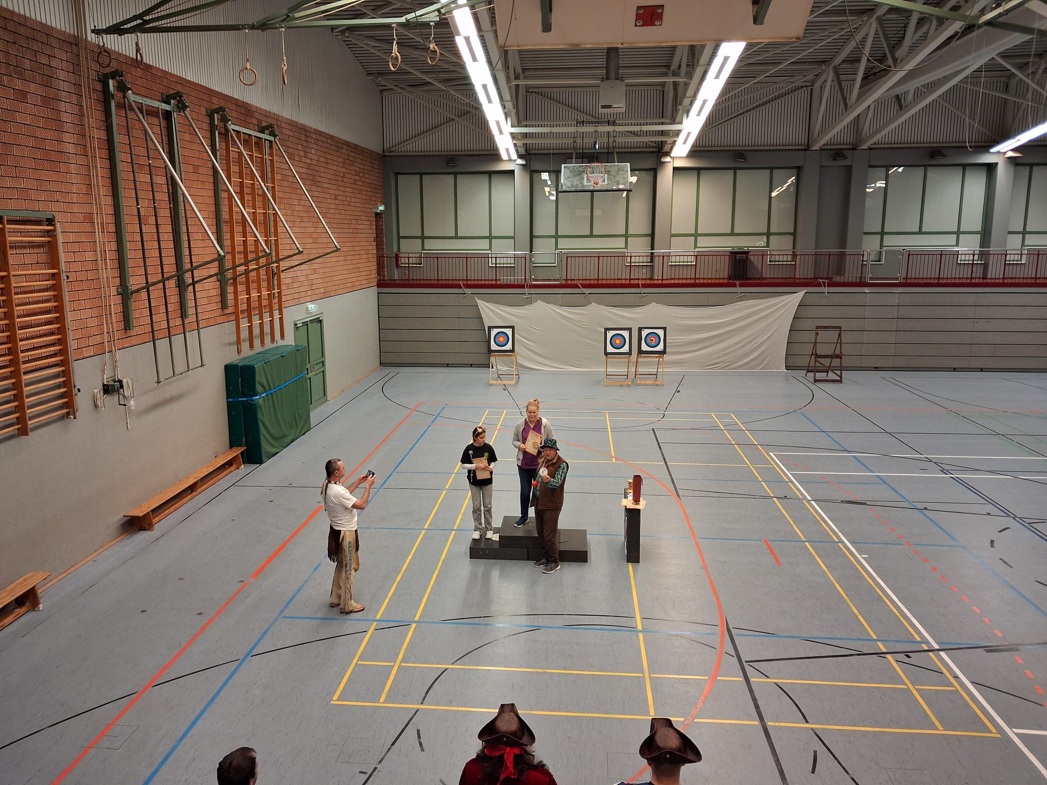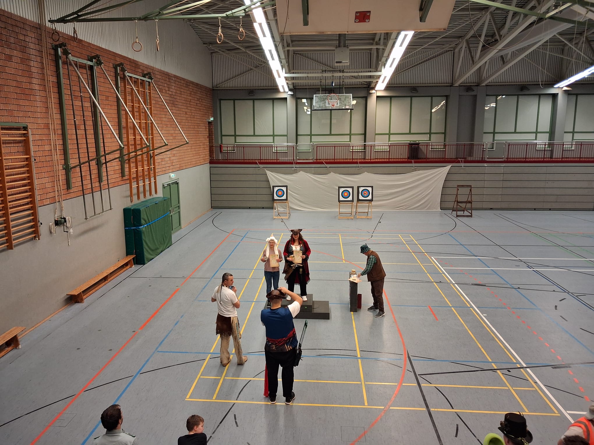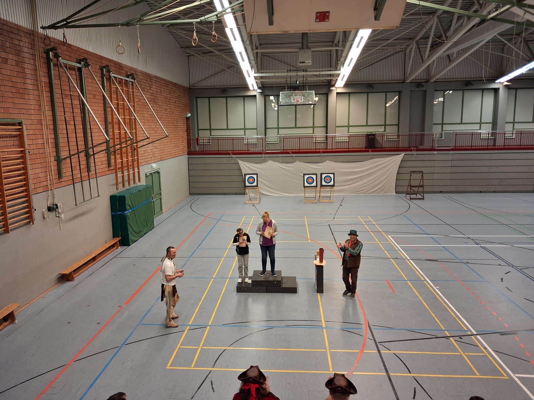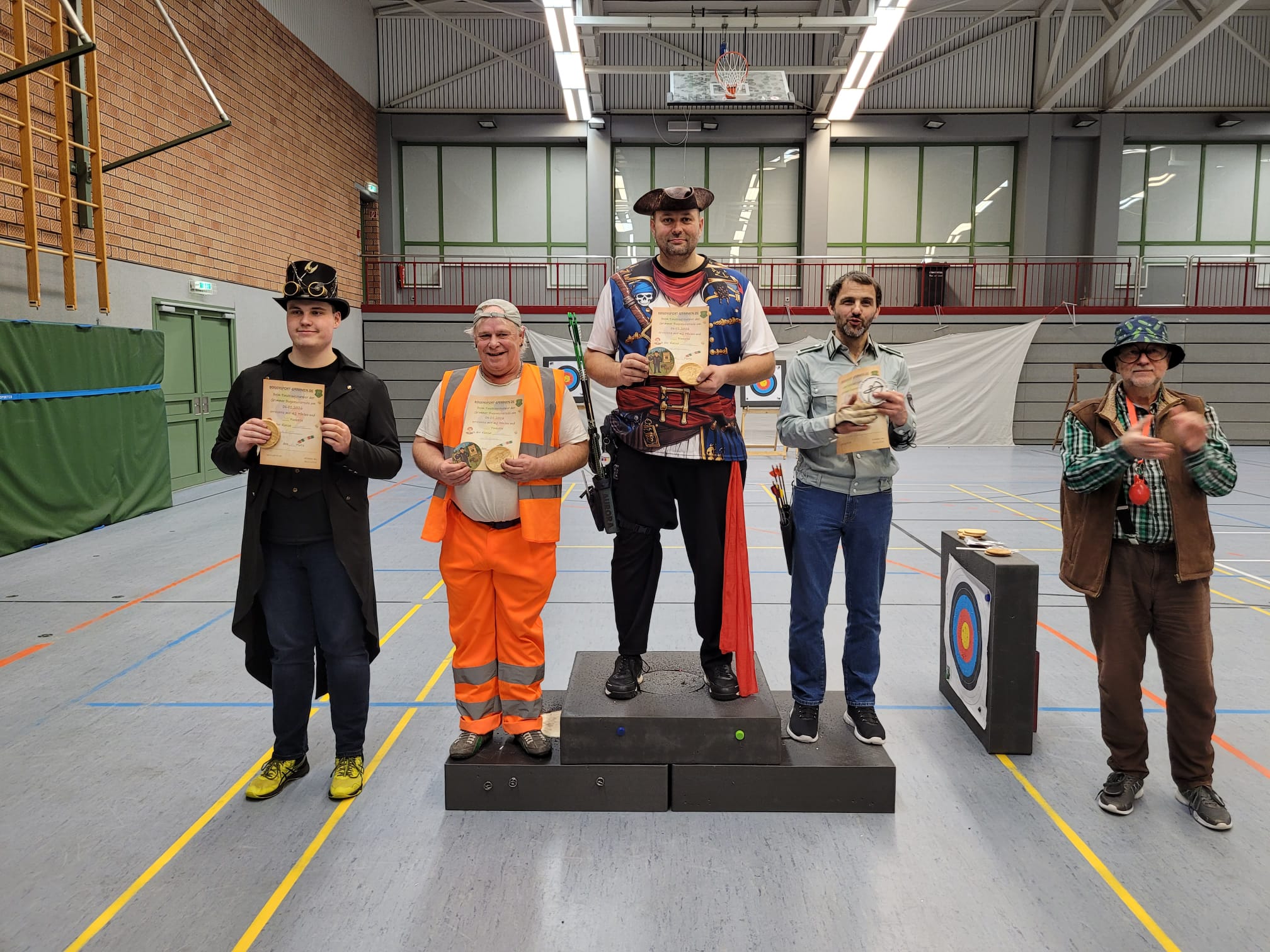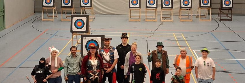 Der erste Versuch am 6.6.2026 fiel bedingt durch den Eisregen und die Schließung des Gymnasiums aus. Aber nicht ersatzlos. Der zweite Versuch wurde am 27.02.2026 gestartet und diesmal erfolgreich. Auch der dezente Hinweis auf stark erhöhtes Startgeld, beim Erscheinen ohne Kostüm wurde beachtet. Es waren so Piraten, Mitarbeiter der Schutzpolizei, polnische Gurkenpflücker aus dem Spreewald, Gothic Punk Vernarrte usw. dabei.Pünktlich, 10 Minuten später als geplant, ging es los. Drei Runden einschießen und die extra angefertigten Scheibenauflagen wurden erläutert. Geplant waren 14 Runden a 3 Pfeile. Das konnten wir diesmal sogar einhalten. Nach 7 Runden durften sich alle Teilnehmer erstmal stärken. Es gab Pfannkuchen satt, Kaffee satt, Wasser und Apfelschorle. Die letzten 7 Runden sind dann relativ schnell vergangen, bis auf die Schützen die einige Runden nachschießen mussten. Aber Alle sollten die Chance haben einen tollen Preis zu erhalten. In der Zeit der Auswertung und der Urkunden geschrieben wurden, gab es eine Sonderwertung. Getrennt nach Kinder und Erwachsene ging es um den goldenen Löffel. Gewinner waren hier Jörg und Ole. Sie hatten auf der Dartscheibe und beim Bingo die höchste Trefferzahl. Auch bei der Siegerehrung gab es leichte Probleme, da wir nun insgesamt 4 zweite Plätze hatten und Keiner einen Entscheidungspfeil schießen wollte. Aber auch das konnte elegant gelöst werden. Diesmal gab es besondere Preise. Individuell gefertigte Untersetzer für die Überlebenden des Wintersturms Elli und erstmalig wurde unsere neuen Werbeflyer vorgestellt. Jeder Teilnehmer erhielt auch den Flyer. Auch im nächsten Jahr gibt es wieder ein Faschingsturnier, angeleitet von Robin Hood. Versprochen.