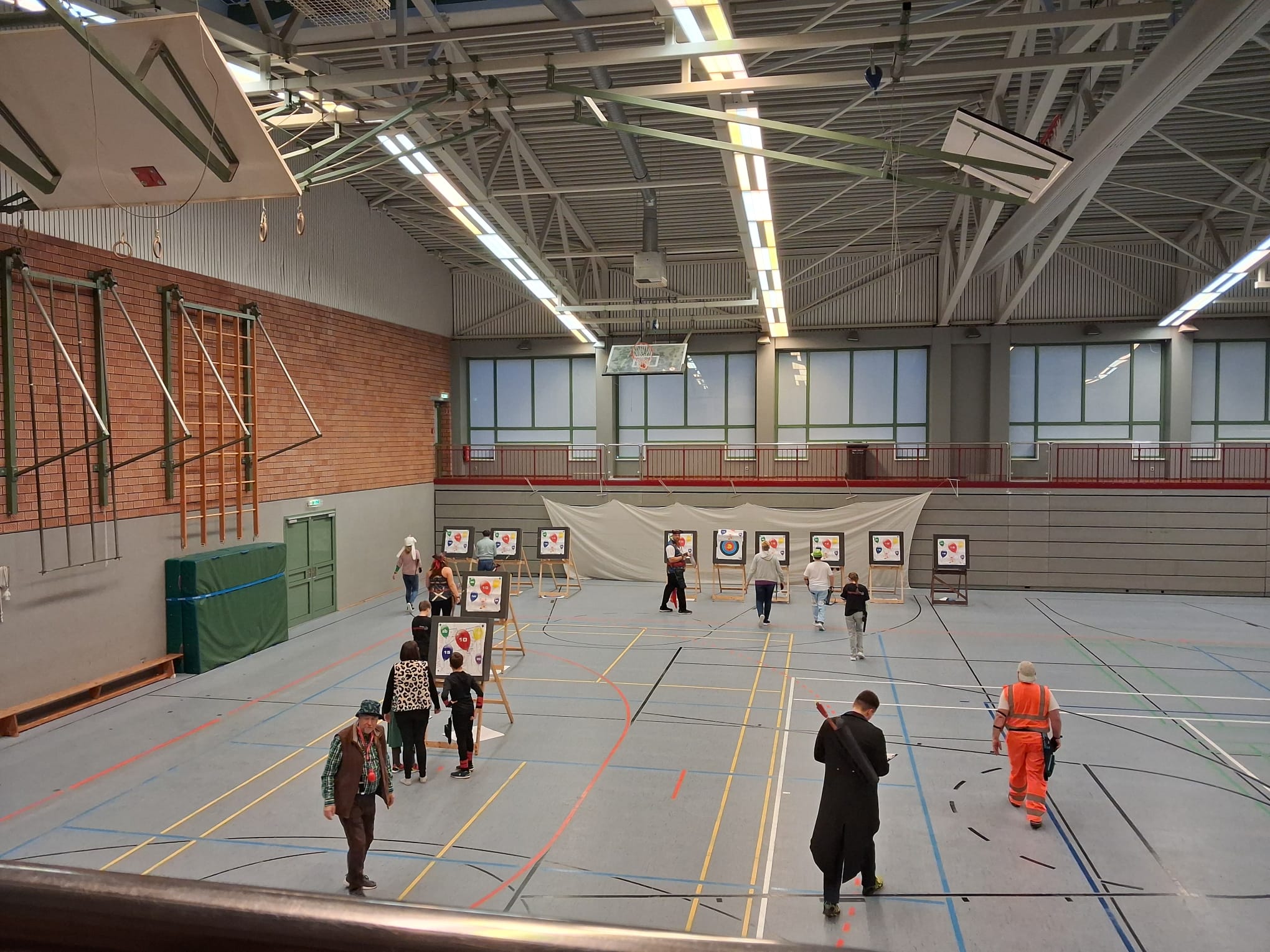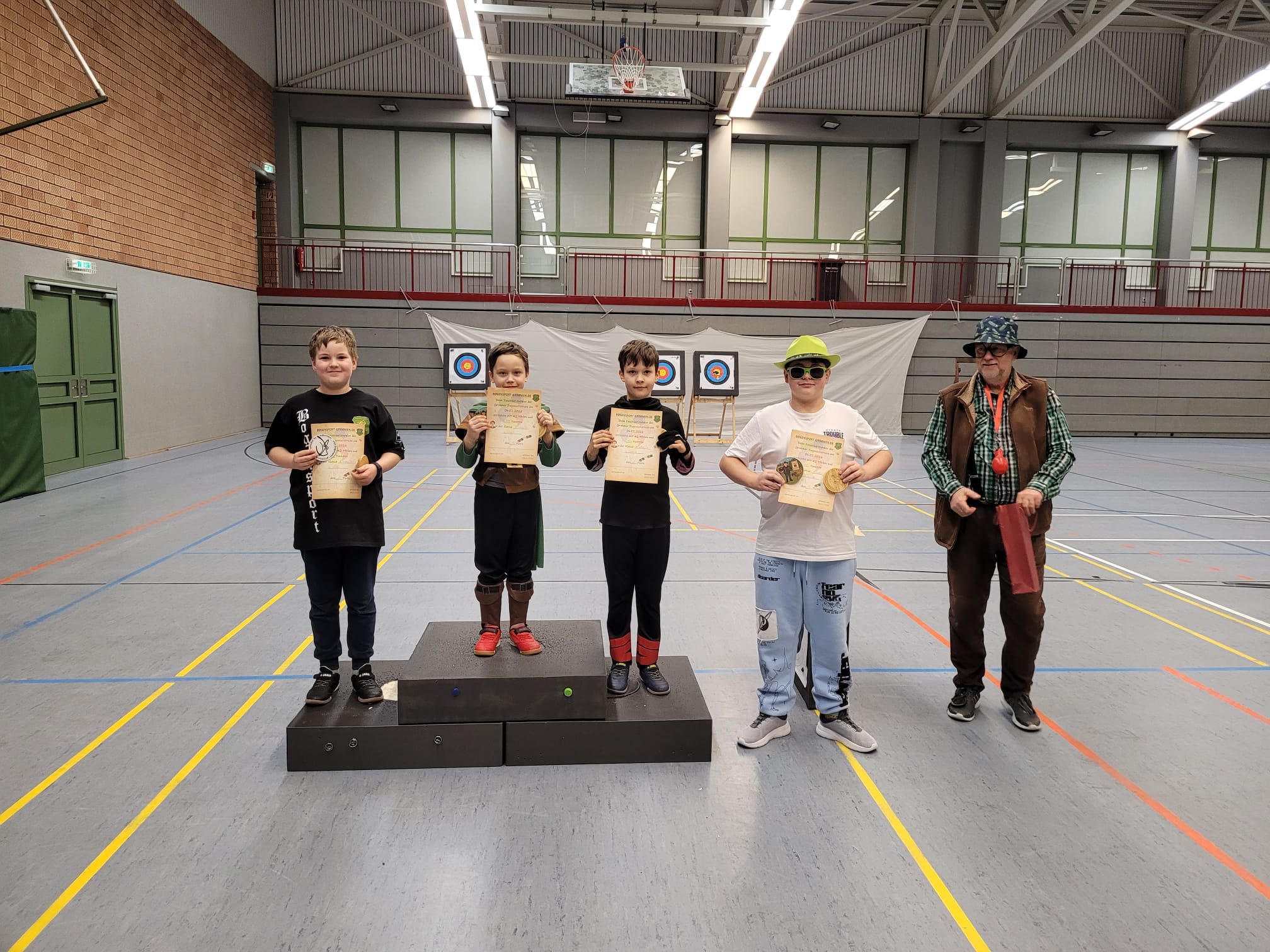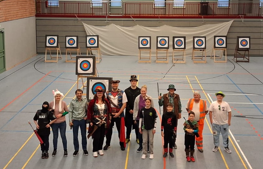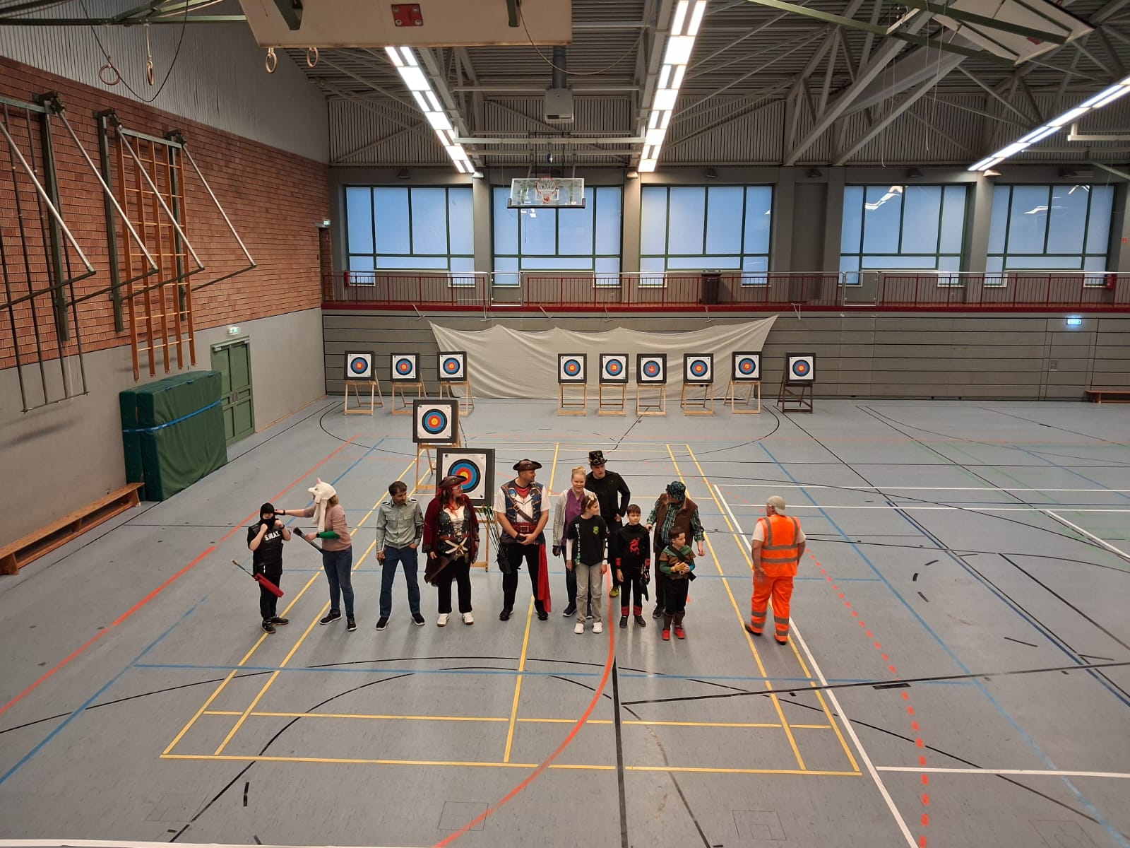 Der erste Versuch am 6.6.2026 fiel bedingt durch den Eisregen und die Schließung des Gymnasiums aus. Aber nicht ersatzlos. Der zweite Versuch wurde am 27.02.2026 gestartet und diesmal erfolgreich. Auch der dezente Hinweis auf stark erhöhtes Startgeld, beim Erscheinen ohne Kostüm wurde beachtet. Es waren so Piraten, Mitarbeiter der Schutzpolizei, polnische Gurkenpflücker aus dem Spreewald, Gothic Punk Vernarrte usw. dabei.Pünktlich, 10 Minuten später als geplant, ging es los. Drei Runden einschießen und die extra angefertigten Scheibenauflagen wurden erläutert. Geplant waren 14 Runden a 3 Pfeile. Das konnten wir diesmal sogar einhalten. Nach 7 Runden durften sich alle Teilnehmer erstmal stärken. Es gab Pfannkuchen satt, Kaffee satt, Wasser und Apfelschorle. Die letzten 7 Runden sind dann relativ schnell vergangen, bis auf die Schützen die einige Runden nachschießen mussten. Aber Alle sollten die Chance haben einen tollen Preis zu erhalten. In der Zeit der Auswertung und der Urkunden geschrieben wurden, gab es eine Sonderwertung. Getrennt nach Kinder und Erwachsene ging es um den goldenen Löffel. Gewinner waren hier Jörg und Ole. Sie hatten auf der Dartscheibe und beim Bingo die höchste Trefferzahl. Auch bei der Siegerehrung gab es leichte Probleme, da wir nun insgesamt 4 zweite Plätze hatten und Keiner einen Entscheidungspfeil schießen wollte. Aber auch das konnte elegant gelöst werden. Diesmal gab es besondere Preise. Individuell gefertigte Untersetzer für die Überlebenden des Wintersturms Elli und erstmalig wurde unsere neuen Werbeflyer vorgestellt. Jeder Teilnehmer erhielt auch den Flyer. Auch im nächsten Jahr gibt es wieder ein Faschingsturnier, angeleitet von Robin Hood. Versprochen.