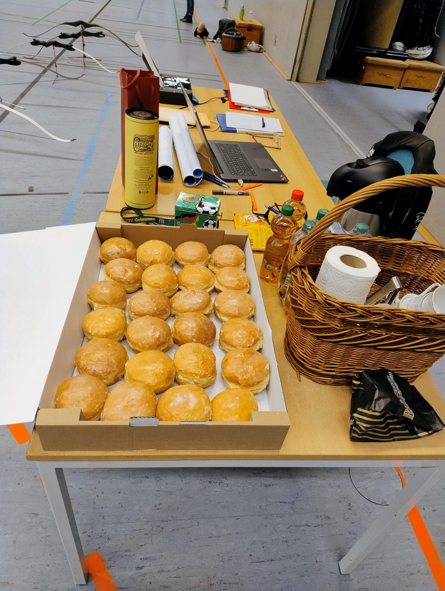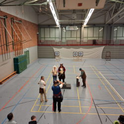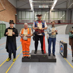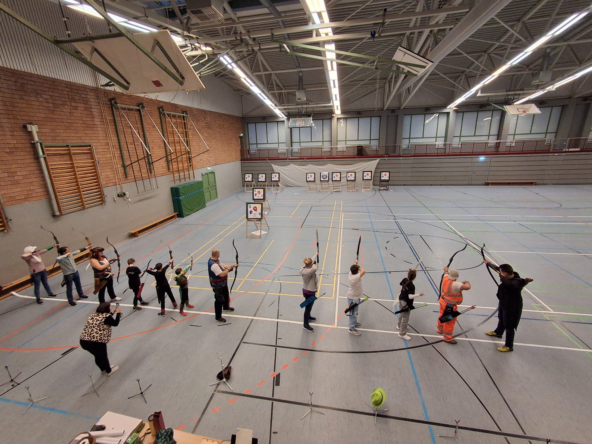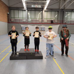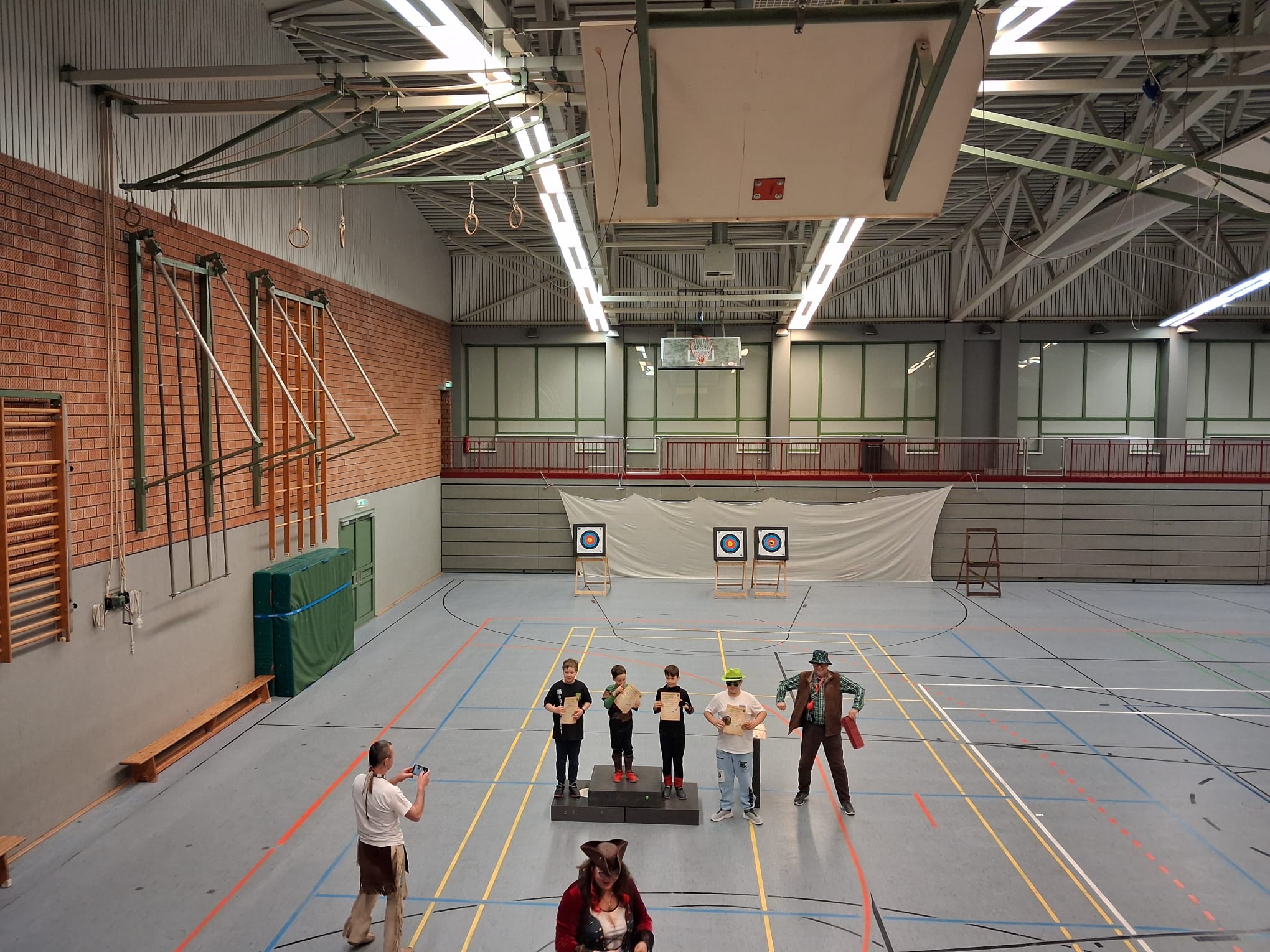 Der erste Versuch am 6.6.2026 fiel bedingt durch den Eisregen und die Schließung des Gymnasiums aus. Aber nicht ersatzlos. Der zweite Versuch wurde am 27.02.2026 gestartet und diesmal erfolgreich. Auch der dezente Hinweis auf stark erhöhtes Startgeld, beim Erscheinen ohne Kostüm wurde beachtet. Es waren so Piraten, Mitarbeiter der Schutzpolizei, polnische Gurkenpflücker aus dem Spreewald, Gothic Punk Vernarrte usw. dabei.Pünktlich, 10 Minuten später als geplant, ging es los. Drei Runden einschießen und die extra angefertigten Scheibenauflagen wurden erläutert. Geplant waren 14 Runden a 3 Pfeile. Das konnten wir diesmal sogar einhalten. Nach 7 Runden durften sich alle Teilnehmer erstmal stärken. Es gab Pfannkuchen satt, Kaffee satt, Wasser und Apfelschorle. Die letzten 7 Runden sind dann relativ schnell vergangen, bis auf die Schützen die einige Runden nachschießen mussten. Aber Alle sollten die Chance haben einen tollen Preis zu erhalten. In der Zeit der Auswertung und der Urkunden geschrieben wurden, gab es eine Sonderwertung. Getrennt nach Kinder und Erwachsene ging es um den goldenen Löffel. Gewinner waren hier Jörg und Ole. Sie hatten auf der Dartscheibe und beim Bingo die höchste Trefferzahl. Auch bei der Siegerehrung gab es leichte Probleme, da wir nun insgesamt 4 zweite Plätze hatten und Keiner einen Entscheidungspfeil schießen wollte. Aber auch das konnte elegant gelöst werden. Diesmal gab es besondere Preise. Individuell gefertigte Untersetzer für die Überlebenden des Wintersturms Elli und erstmalig wurde unsere neuen Werbeflyer vorgestellt. Jeder Teilnehmer erhielt auch den Flyer. Auch im nächsten Jahr gibt es wieder ein Faschingsturnier, angeleitet von Robin Hood. Versprochen.