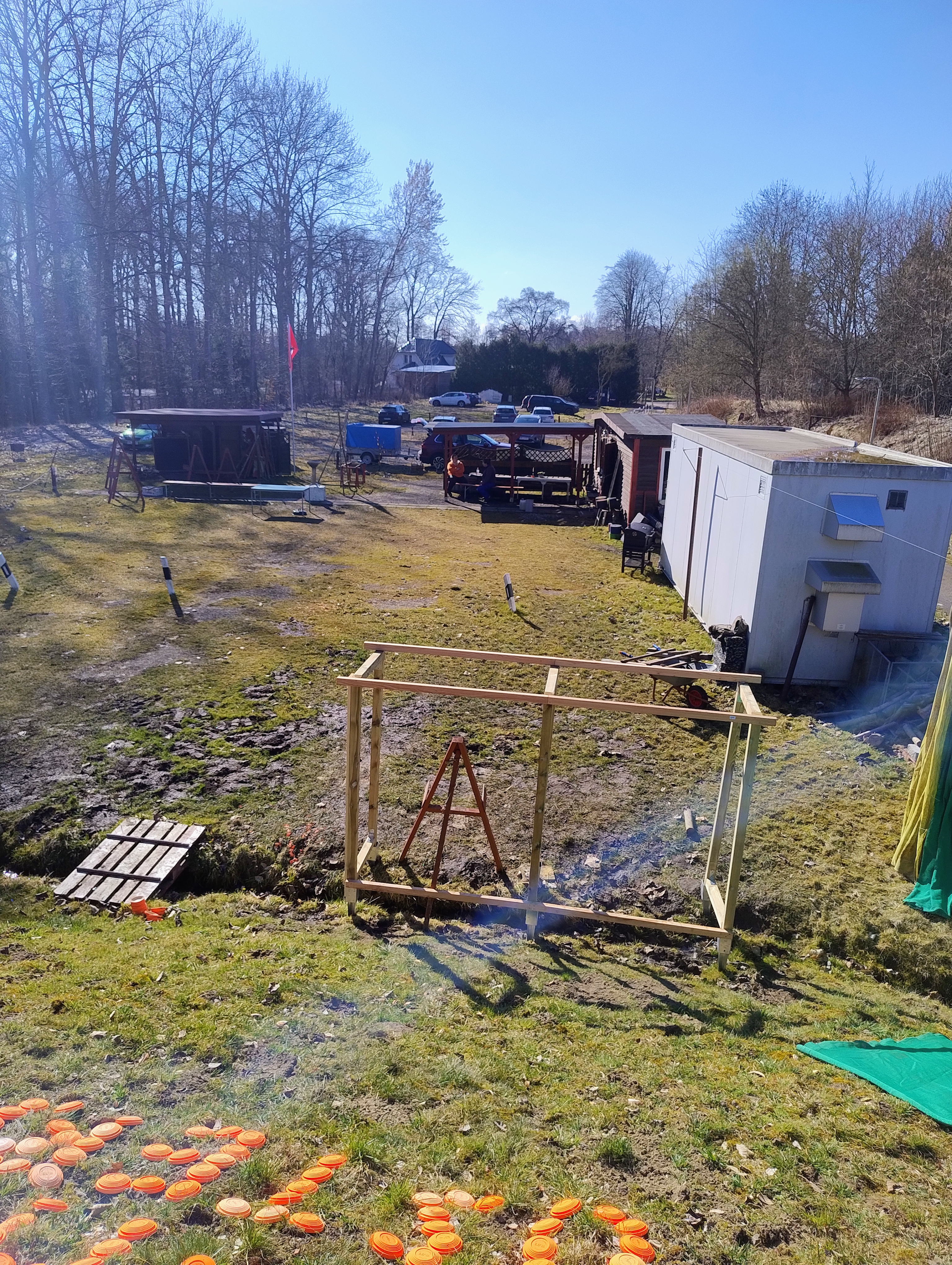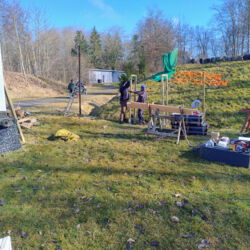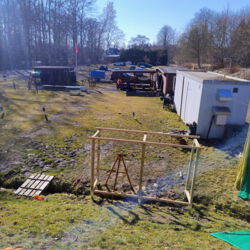 Eine echte Herausforderung wurde beiden Uwes gestellt. Mit verzogenem Holz einen geraden Unterstand bauen. Das Grundgerüst steht nun und kann verkleidet werden. Hier werden dann das ganze Jahr über die neuen 90 mal 90 großen Lamelllenscheiben stehen. Dies konnte nur durch eine Spende eines Vaters realisiert werden. Dankeschön Falk.