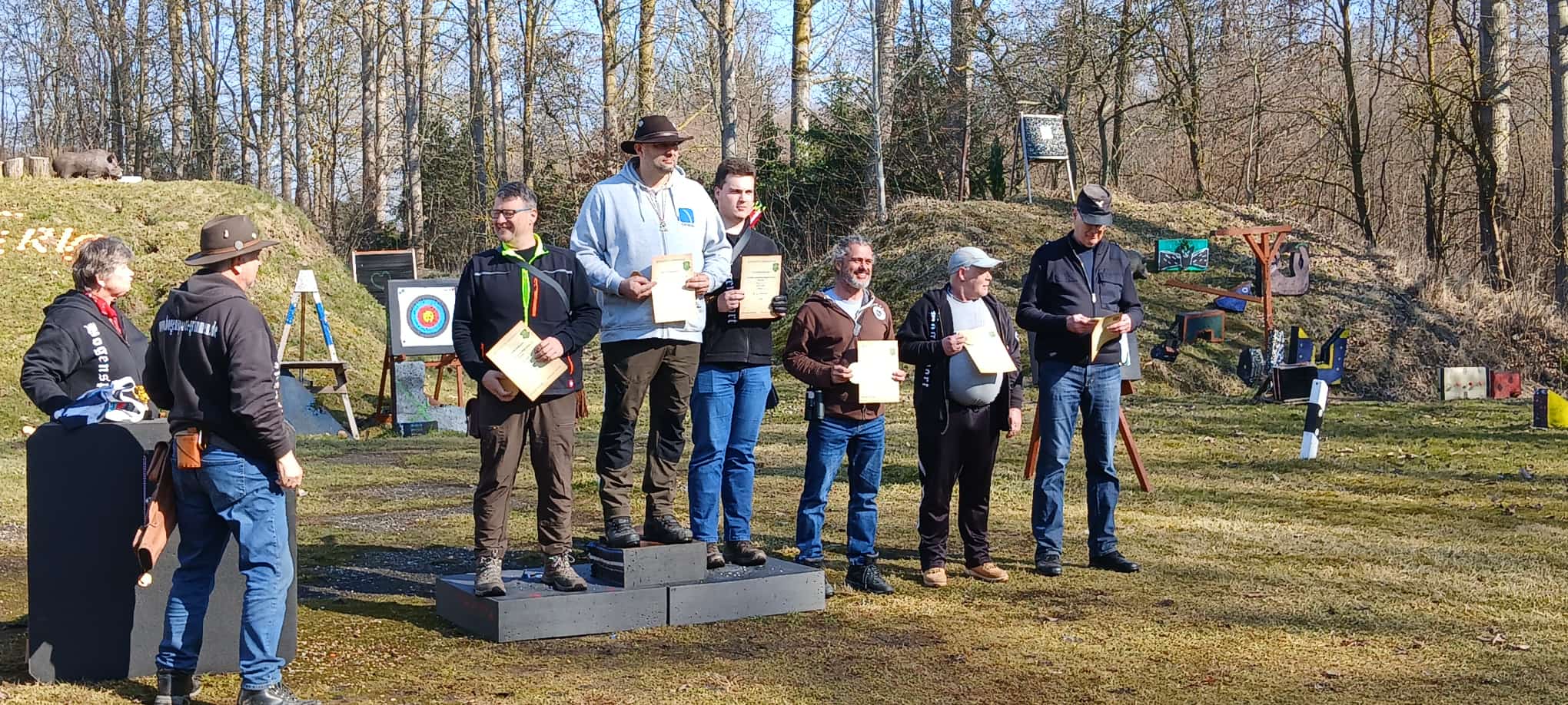 Auch am Sonntag ging es weiter. Überpünktlich ging es mit dem 3D Eröffnungsturnier los. Nach kurzer Ansprache und Einweisung wurden die Rotten zu den Zielen geschickt. Der Aufbau war diesmal erfolgreich gewesen. Es gab nur minimale Änderungswünsche zum Aufbau. Nach knapp 1,5 Stunden war die erste Runde geschafft. Bei der Auswertung stellte sich heraus, dass eigentlich ein Entscheiungspfeil geschossen werden müsste. Aber beide wollten dies nicht. So hatten wir eben zwei zweite Plätze. Gewonnen hat bei den Kindern, Mariella, bei den Jugendlichen, Lina und Matheo, bei den Herren Christian und bei den Damen Conny. Die höchste Punktzahl erreichte Lina. Dafür gab es eine Zielscheibe und Mathilda bekam einen kleinen Pokal.